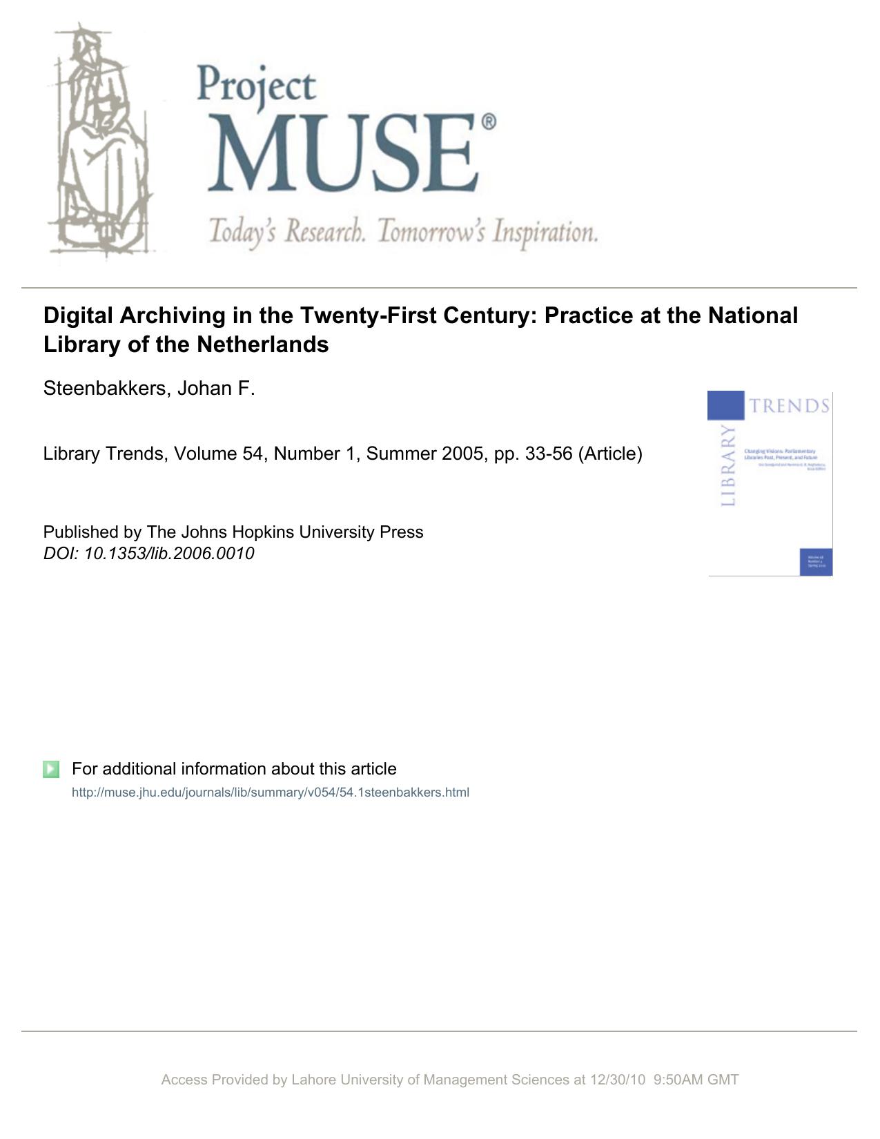 This article discusses the digital archiving practices at the National Library of the Netherlands (Koninklijke Bibliotheek, KB), focusing on strategies and challenges in preserving digital information for future access.