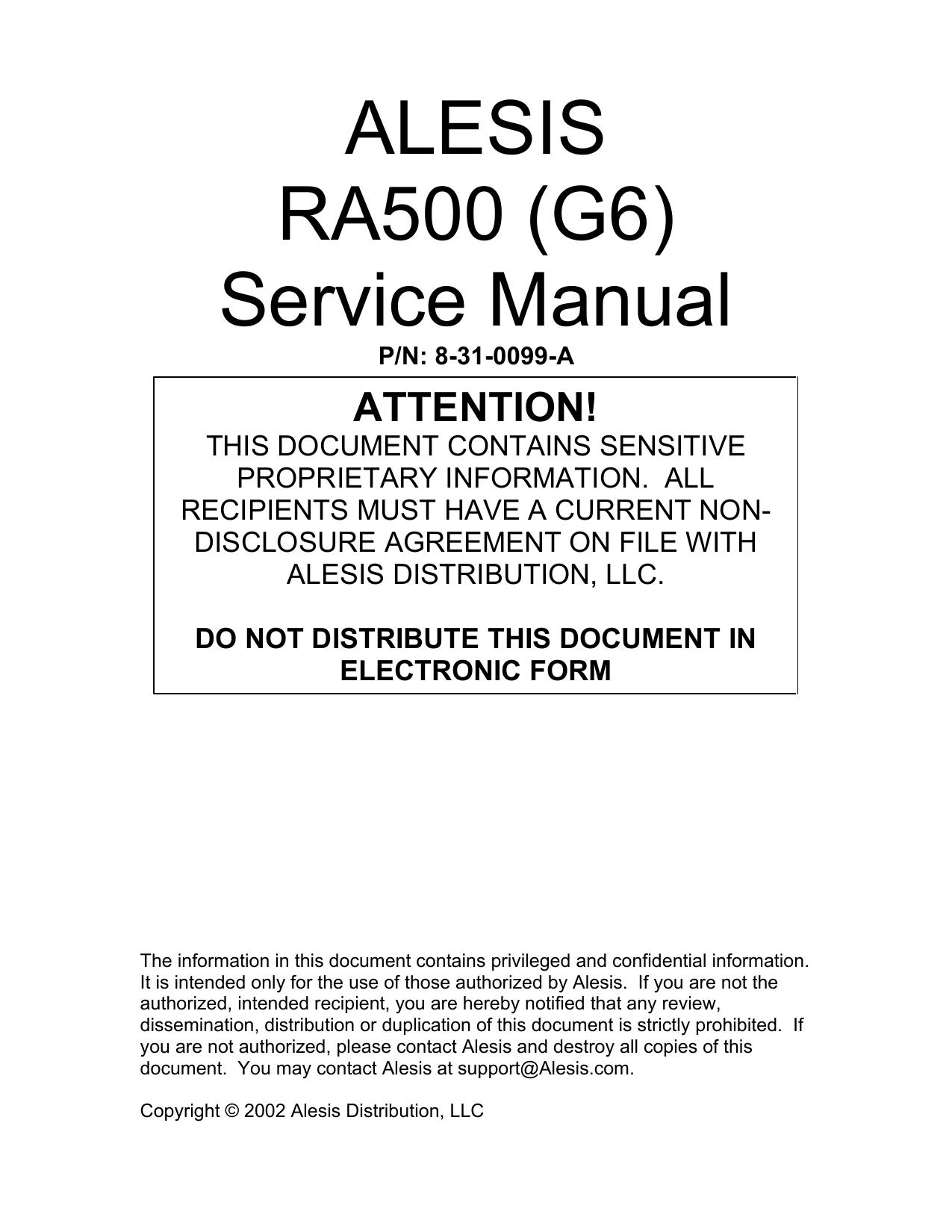 This service manual provides comprehensive technical information for the Alesis RA500 (G6) power amplifier, including schematics, PCB layouts, and a bill of materials (BOM). It is designed to assist technicians in the operation, maintenance, and repair of the amplifier.