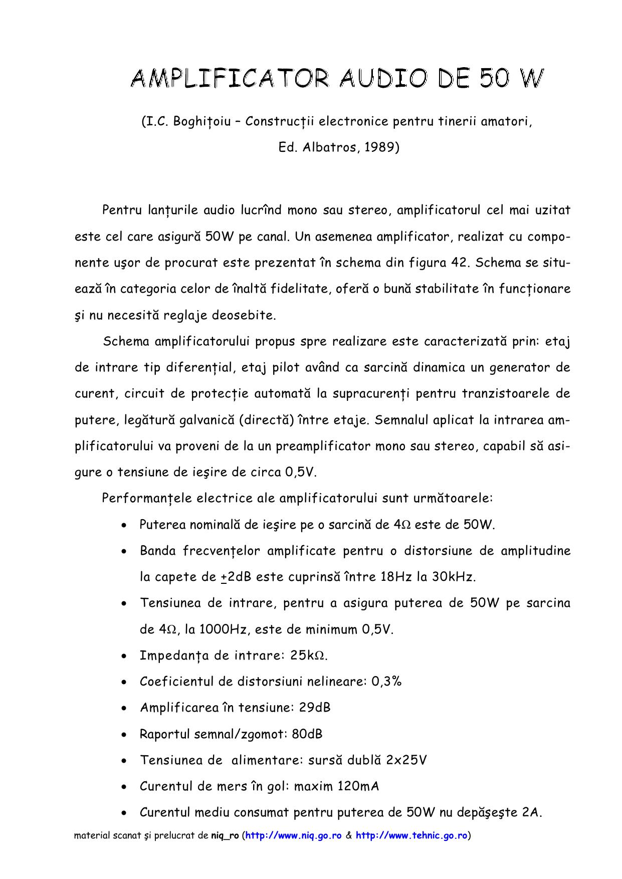 A practical project (≈9 pages) giving the schematic, parts list and construction notes for a 50 W audio amplifier aimed at hobbyists and amateur builders. The article presents a tried-and-tested amplifier circuit (a LECSON-type variant is mentioned in later commentary), construction tips and basic performance data — intended for readers building their own hi-fi/portable amplifiers.