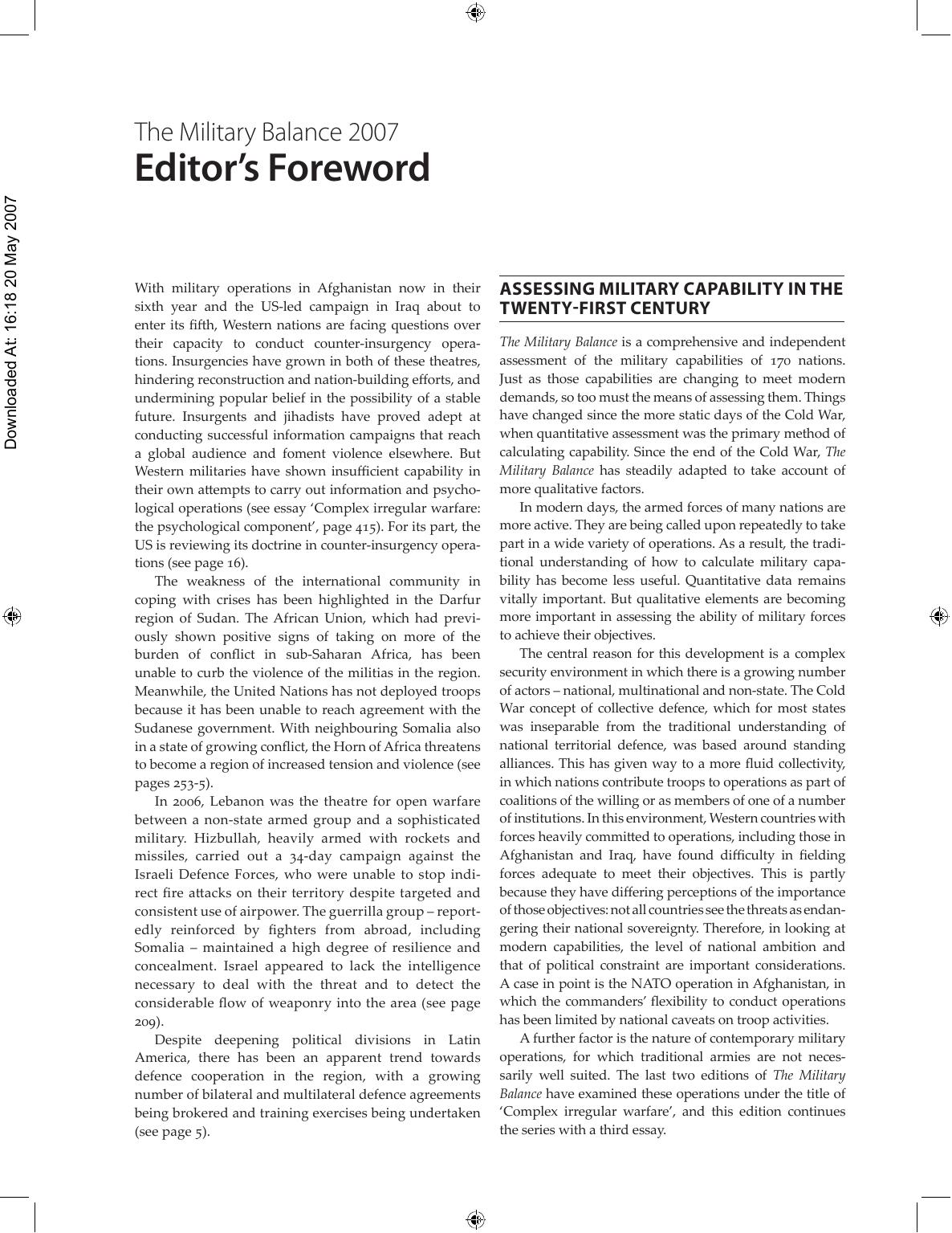 The Military Balance 2007 is the 107th annual edition of the authoritative global assessment by the IISS of the military capabilities and defense economics of nearly 170 countries.