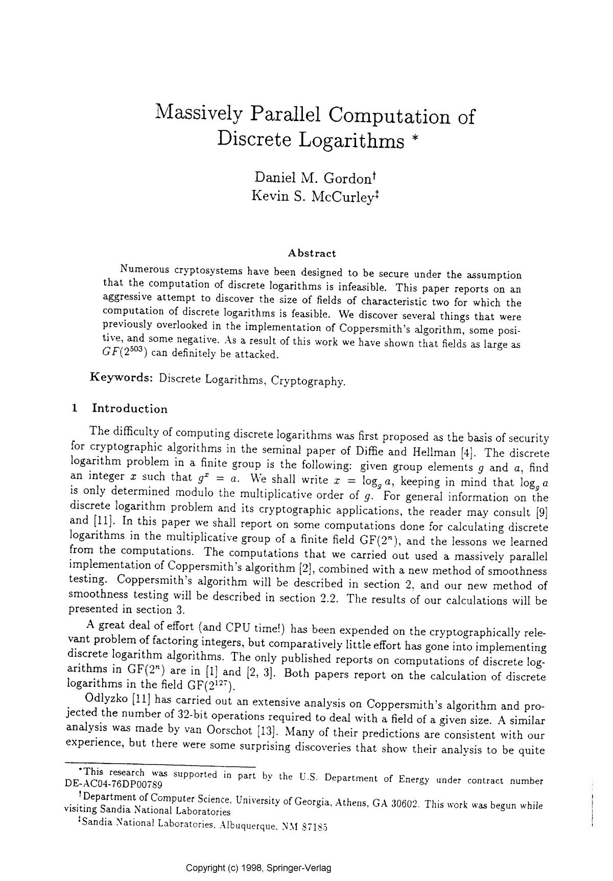 Subjects: Advances in Cryptology - Crypto '92 Lecture Notes in Computer Science Volume 740 discrete logarithms Coppersmith algorithm