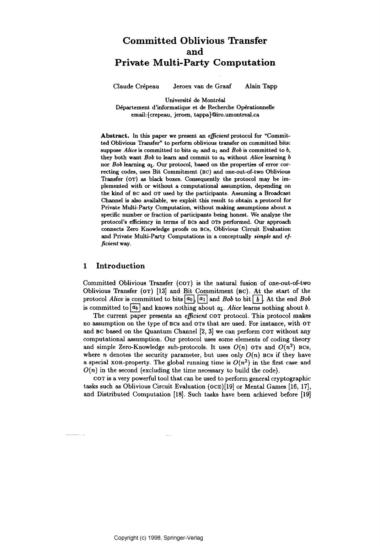 Subjects: Advances in Cryptology - EuroCrypt '92, Lecture Notes in Computer Science Volume 658, oblivious transfer